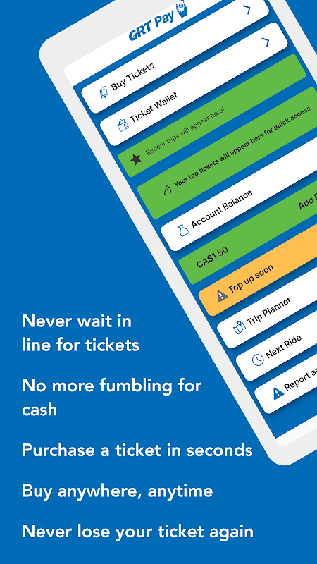 GRT Pay lets you purchase Grand River Transit fares conveniently on your mobile device. Never wait in line. No more fumbling with coins. Your tickets are stored directly on your device and can be activated when you're ready to board.