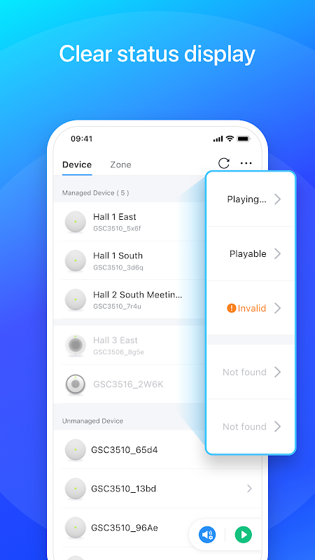 GSC Assistant is a mobile client that works with the GSC series of Grandstream. It supports fast management and playback of GSC3516/3506/3510/3505 products on the mobile device.Supports fast management of GSCs in the same LAN, quick positioning and convenient playback of single GSC, custom partitioning of multiple GSCs, and unified playback for multiple zones. Supports IPv4 and IPv6, and is compatible with complex network environments. GSC Assistant enables users to manage GSCs playback more conveniently and quickly, allowing GSCs to better integrate into users' work and life.