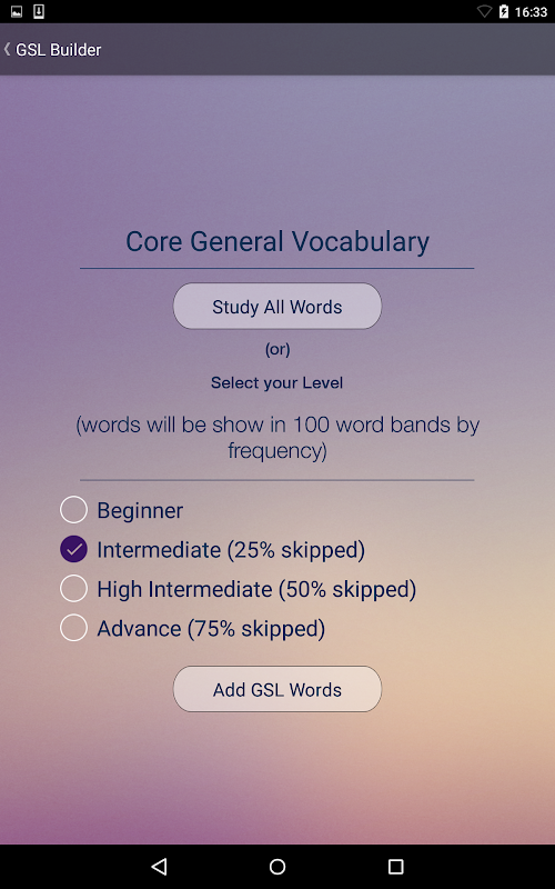 This application is designed to help learners and teachers make use of the highly regarded General Service List of vocabulary (GSL) developed by Dr. Michael West. This list of 1800 words are the most frequent and most important words of English. Although there are more than 600,000 words in the English language knowledge of just the 1800 core words gives you 84% coverage of words in any English text.