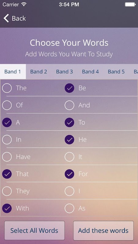 The app also contains an Intelligent Wordlist Maker and Intelligent Flashcard system. The Intelligent Wordlist Maker helps you to quickly and efficiently pick only the words you don’t know for study in the flashcard system. Rather than force you to go through the entire list at once, Intelligent Wordlist Maker guides you through the list by frequency bands, allowing you to add words little by little, just as you need them or when you have time.