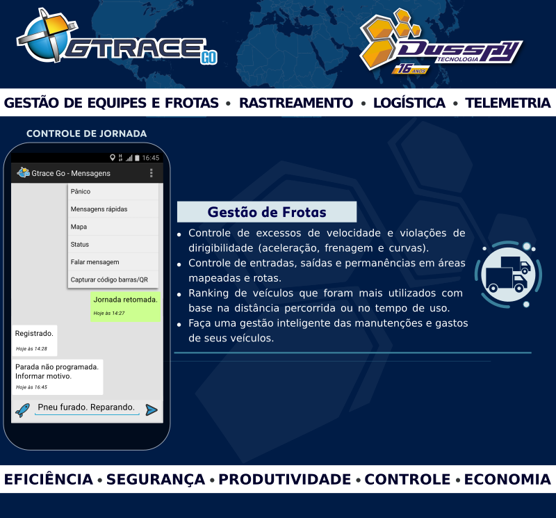 Superaplicativo que transforma o smartphone ou tablet em um moderno rastreador com comunicador integrado, podendo ser utilizado para diversas finalidades. Utiliza todos os recursos existentes no aparelho, como: GPS, acelerômetro, gprs, wi-fi, bluetooth, alto-falante, microfone, cartão de memória, etc. Dispensa a necessidade de instalação de equipamentos rastreadores no veículo.