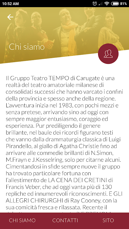 With this application it is possible to obtain information on the Teatro Tempo Group, consult the scripts also through detailed research, and view the productions in programming.