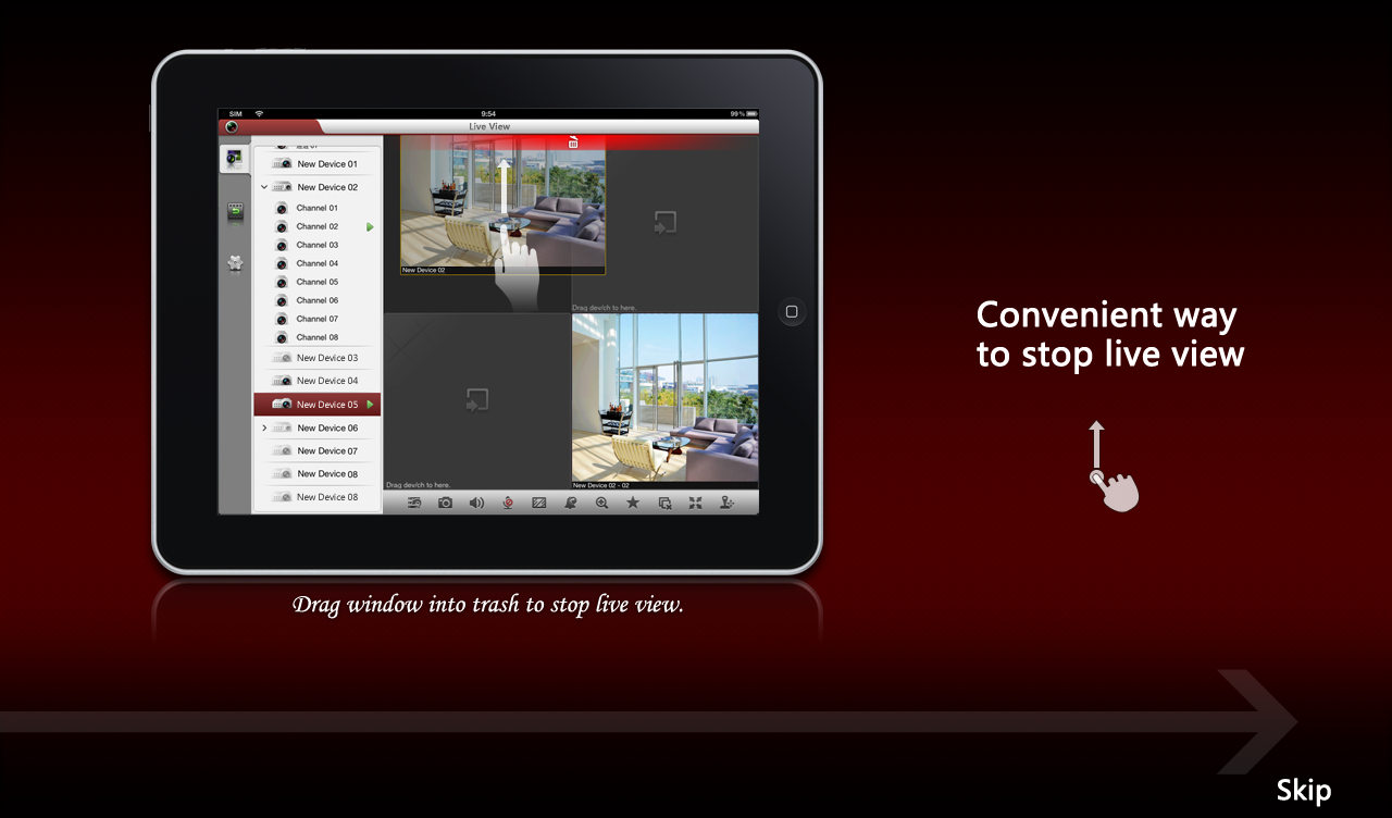 With this software installed in your Android Tablet, you are able to log on to the front-end device via Wi-Fi or 3G; besides, if there is no public IP available for the device, it’s accessible by using a dynamic name, or by mapping ports to the public IP of router.