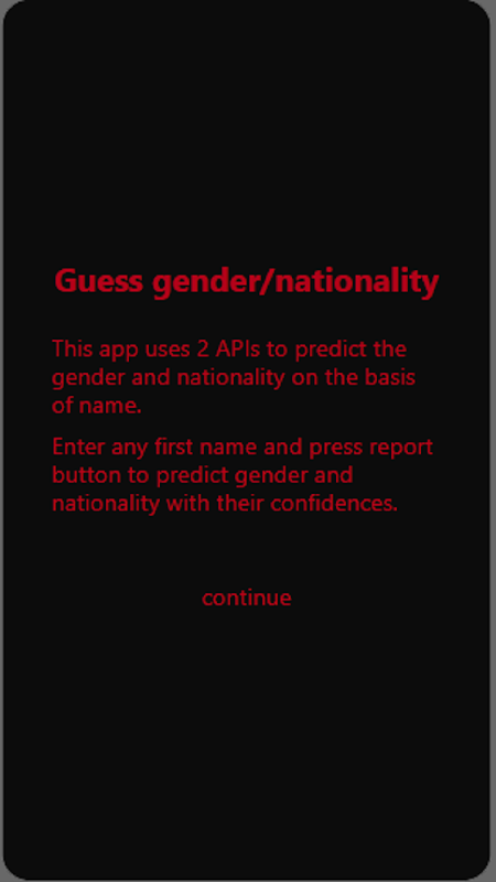 The app allows you to type a name and after you click the report button the app will guess the nationality and gender using its confidence.