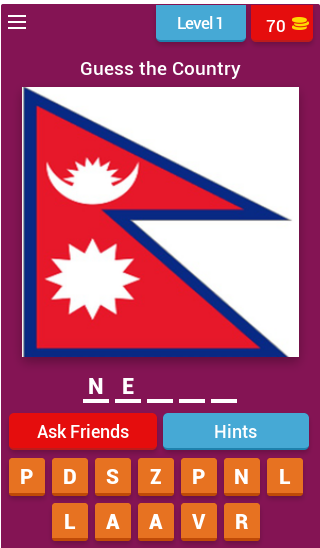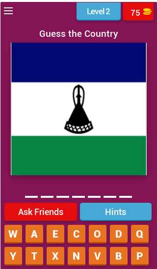 Guess the Country using the flag shown on screen and earn coins for each correct answer.