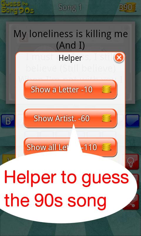 Let 's guess the song the Hint to show the artist or song name and use Helper to show the letters, the picture of artist, and show all the song name.