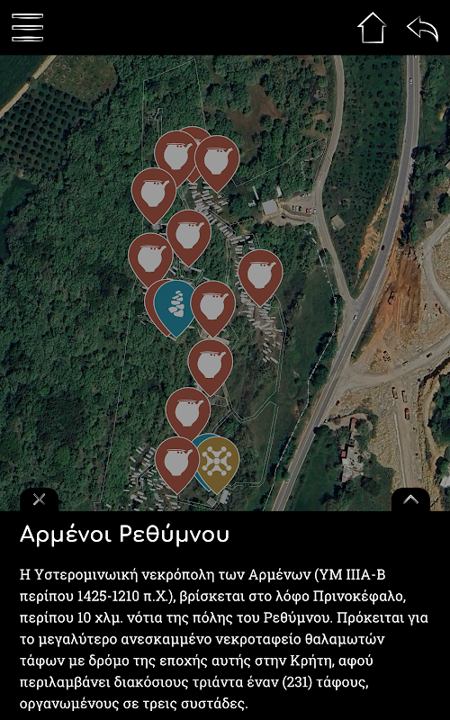 Step into the fascinating world of the protopalatial Centre of Monastiraki in Amari and the minoan cemetary of Armenoi in Rethymno. The mobile application offers an immersive tour of the archaeological sites, showcasing a series of points of interest and significant findings through rich multimedia content, including texts, narrations, and images and 3D reconstructions in an augmented reality environment.