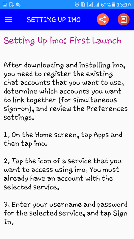 This app is only a guide, and it is not an official app.This app is not affiliated to the official Imo app in any way. We have made this app following the "fair use" guidelines by US law, if you feel there is a direct copyright or trademark violation that doesn't follow within the "fair use" guidelines, please contact us directly.