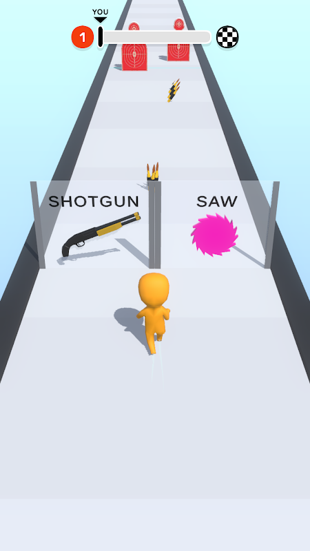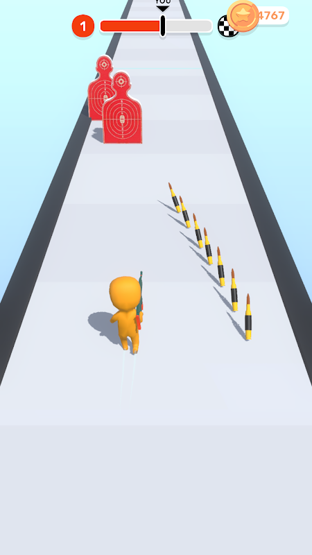 Walk on bullets and weapons to add them to your hero ! Defeat the target blocking your way and get to the end!