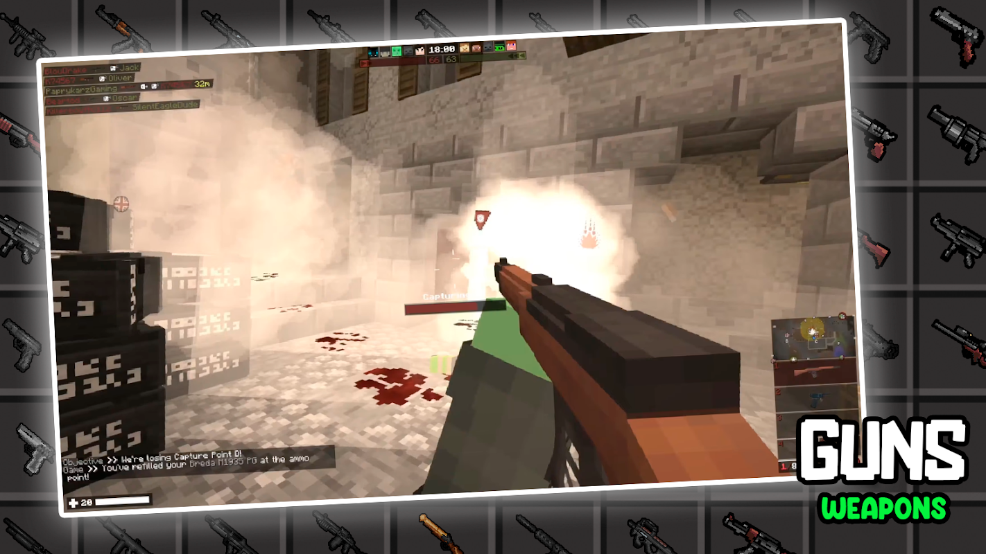Find then newest and best Guns Weapons Mod for minecraft pe mcpe (pocket editon)? with newest features? If you want to aim precisely, you can use a gun's scope. Every sound is juicy and has an echo, creating the illusion of the sound spreading for miles away. When the gun runs out of ammo, it'll start reloading automatically under the condition of you having the right ammo magazine in your inventory and trying to shoot.