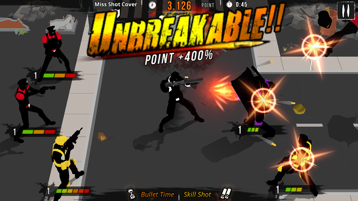 Tap and hold on your character to activate Bullet Time! When Bullet Time is on, time slows down for you to take down enemies with ease, and you can also gain bonus points. After Bullet Time ends, a flashy camera shot and replay is shown to accentuate stylish gunfire scenes to the limit!