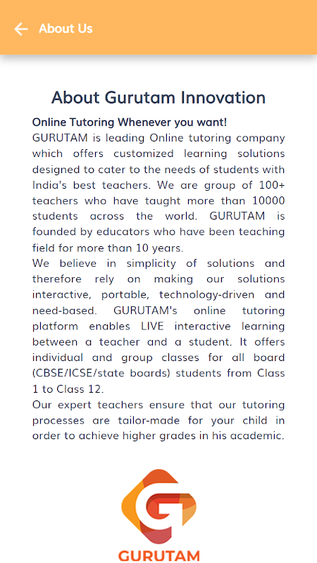 GURUTAM is leading Online tutoring company which offers customized learning solutions designed to cater to the needs of students with India's best teachers. We are group of 100+ teachers who have taught more than 10000 students across the world. GURUTAM is founded by educators who have been teaching field for more than 10 years.