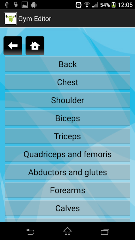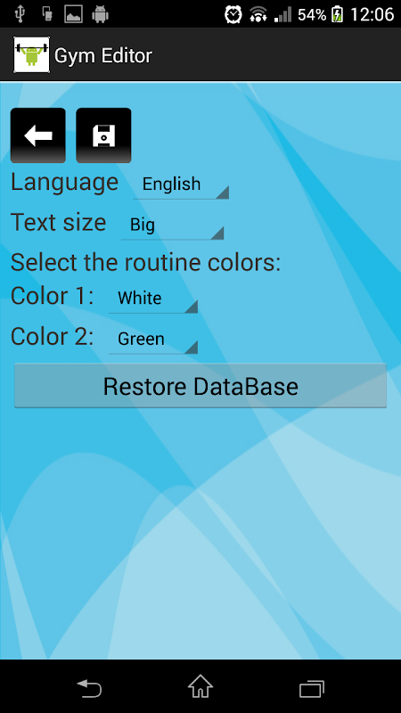 Aplicación para editar rutinas de entrenamiento físico en un gimnasio. Menú de entrenador y usuario separados. Database with ability to edit and store workouts by day or muscle group, setting weights, sets, number of repetitions and observations. Counter series and countdown timer for each exercise. Finder of exercises. Ability to add exercises. BMI Calculator.