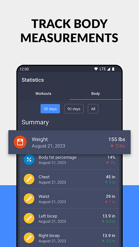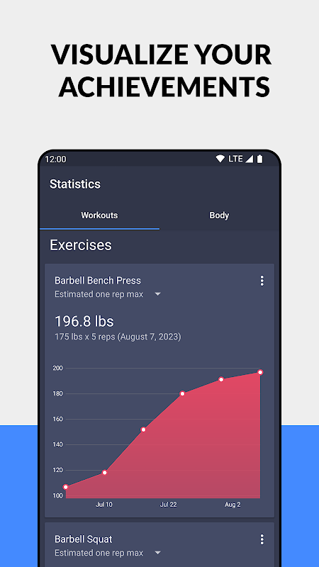 • Visualize your gains with one-rep max (1RM) charts for compound lifts like squats, bench press, and deadlifts.