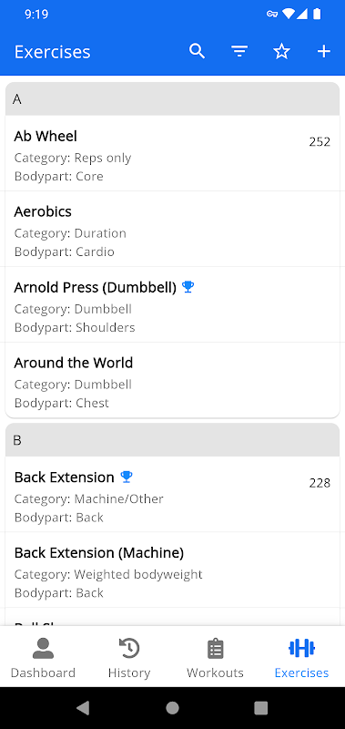 - Exercise search, filtering and favorites