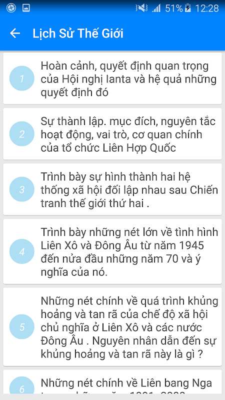 - Ứng dụng tổng hợp tất cả các nội dung về Lịch Sử Việt Nam và Lịch Sử Thế Giới.Với những bài luyện tập theo dạng trắc nghiệm giúp các bạn học sinh có thể vừa học vừa chơi và rất dễ nhớ.Hơn nữa các bạn còn có cả 1 kho tổng hợp các câu hỏi dạng tự luận Lịch Sử