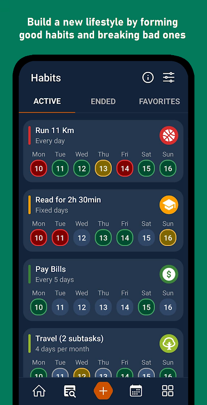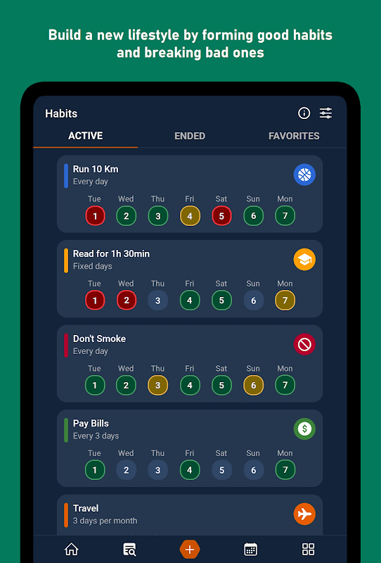 Create habits for a variety of distinct categories, each with specific goals set to your choosing.
