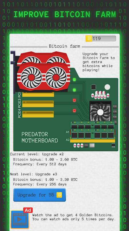 Do you want to speed up the progress of the game or get a bonus to the bitcoins you earn? Improve your startup! Four branches of development will help you to significantly increase your advantage in the game. You can also improve your bitcoin farm to increase the profit in the game!