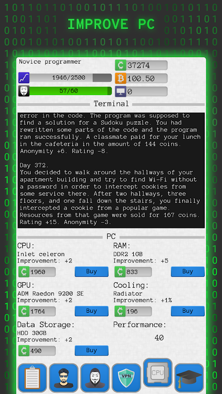 Do you want to rule the world of hackers? Study courses and carry out massive DDoS attacks! Fulfill various orders, increase your rating, and get bitcoins for it! Get rid of all suspicions by restoring your anonymity at your regular job!