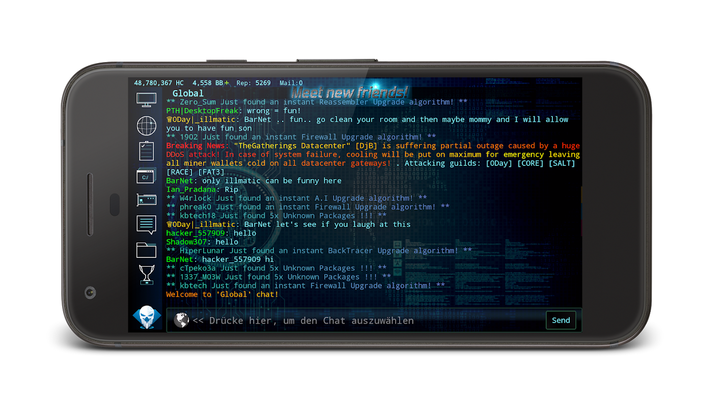 Upgrade your hardware and software, use your A.I and tools to hack into other players and corporations to steal and decrypt secret files, or join a guild and conspire to gain access to another guilds data-centers' main server and destroy it by planting dDoS bots into other players! Meet new friends and plant virtual-viruses in your enemies gateways!