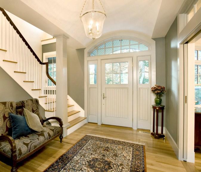 The spacious hall can be made to feel more homely and less sparse if furnishings are to scale - that is, as grand as the room - and if lighting is concentrated upon the lower portion of a tall room. A grouping of upholstered seating placed around a fireplace forms colors on the walls and ceiling will enhance the feeling of coziness and intimacy.