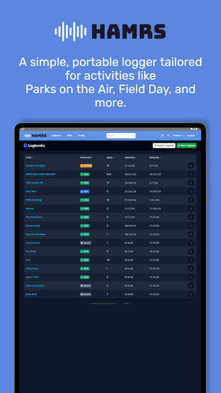 HAMRS Pro has been completely re-written from the ground up. It's a simple amateur radio logger, with templates tailored to portable activities like Parks on the Air, Field Day, and more.