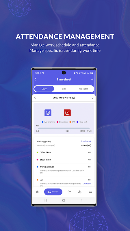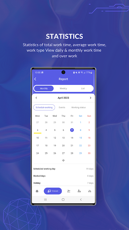 Statistics : You can view the total working hours, average working hours, and working status by day or month.