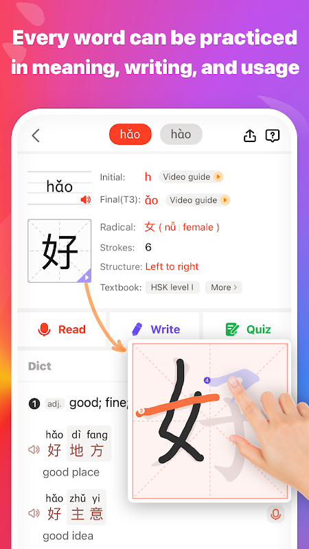 ● Write Chinese characters under the guide of Chinese stroke order and get assessment results of every handwriting stroke, which makes it easier to write Chinese.