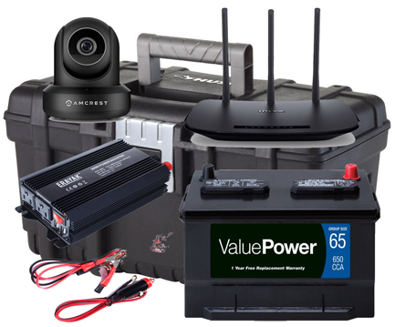 If you need power down range, many cameras use 12v so take a car battery (use voltage regulator if needed).