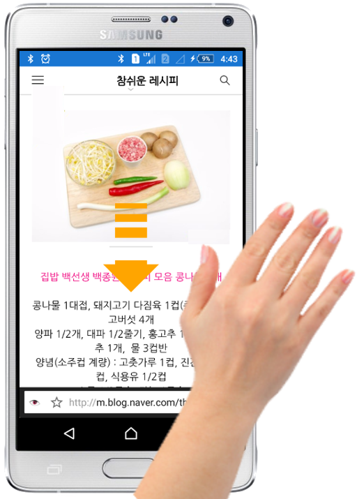 When cooking, crafting, wearing gloves, you want to control your smartphone without touching it. HandsFreeRecipe is a browser for these moments. You can scroll the screen by touchless air hand gestures.