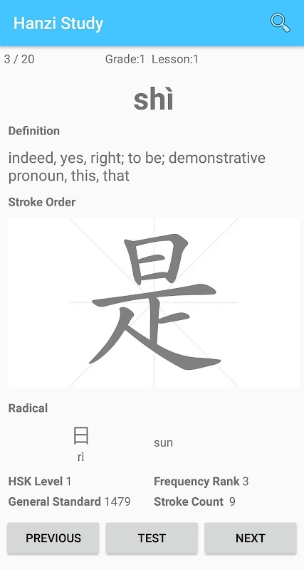Hanzi Study contains over 2600 Hanzi Characters based on HSK character list. HSK (Hànyǔ Shuǐpíng Kǎoshì) is China's standardized exam for non-native speakers that tests and rates Chinese language proficiency