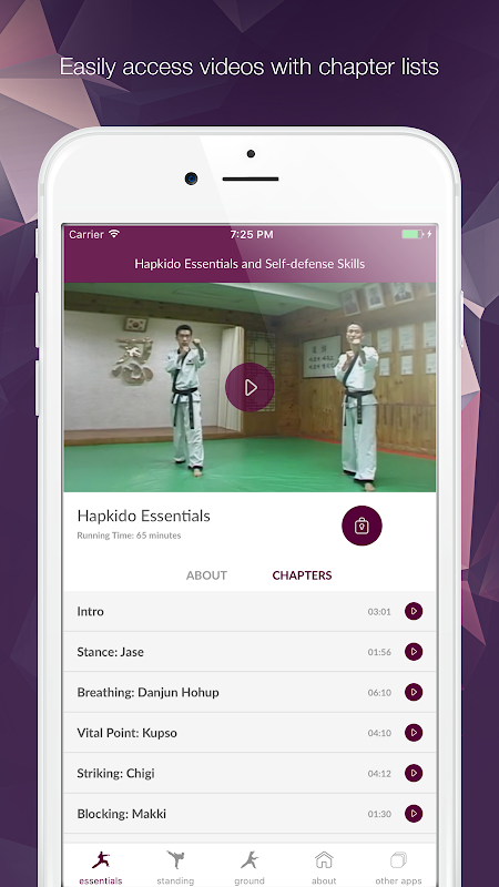 Hapkido is a complete self-defense art, encompassing a full range of striking, kicking, throwing and immobilization techniques. In Hapkido Essentials, learn the kicks, strikes and blocks of Hapkido. Grandmasters Myung Yong Kim, founder of Hapkido Jin Jung Kwan, and Chang Soo Lee, head of Hapkido Jin Jung Kwan personally teach you over 75 hapkido techniques including: stance; beginner through advanced Danjun Breathing methods; vital point theory and practice; elbow, knifehand and backfist striking; single and double arm blocking; forward, backward, side, aero and rolling falls; and single, double, combination and special kicks for a total of 51 kicks! Download the app to see a free preview and get the complete Hapkido Essentials video for $7.99.
