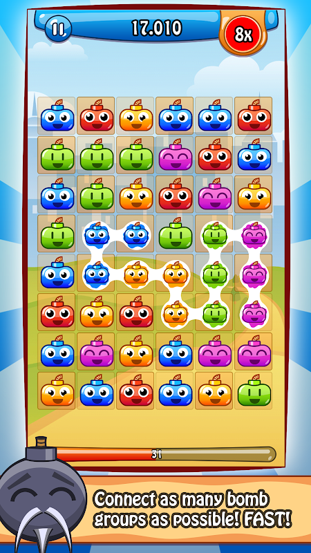 This game is easy to learn, but hard to master. Link groups of Happy Bombs with one swipe of your finger. The more groups you connect at once, the higher will your point multiplier be. Match-3 was yesterday: Connect five red bombs, three yellow bombs and a couple of blue ones to make your points and multiplier go sky-high.