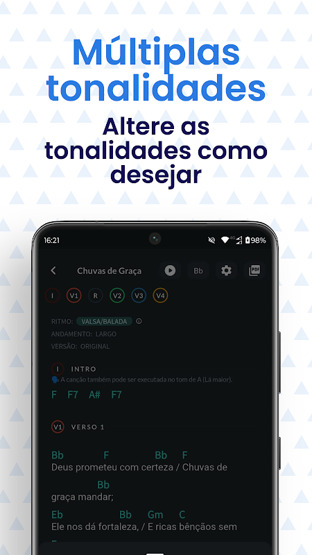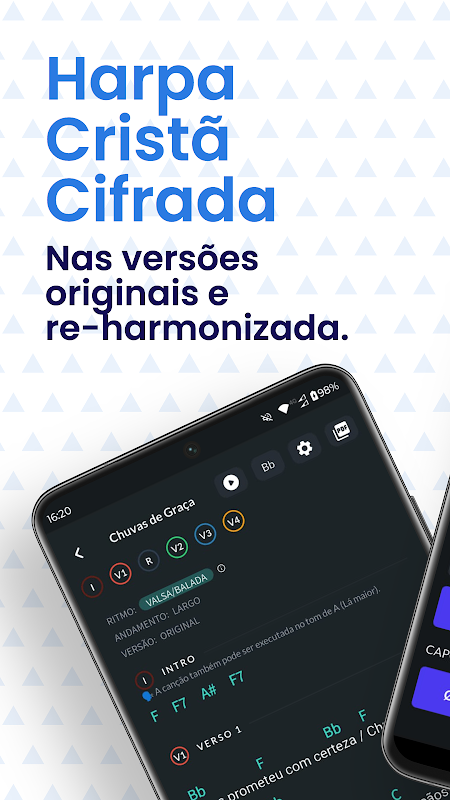 We present a complete solution for congregational musicians: the official hymnal of the Assemblies of God and its affiliated congregations, now available offline. Have in your hands a hymnal that faithfully maintains the original CPAD arrangements. Say goodbye to dependence on low-quality websites or applications that constantly change cipher versions or have poor quality. With our unique app, you'll have access to song lyrics, chords, chord dictionary for the most common instruments and much more.