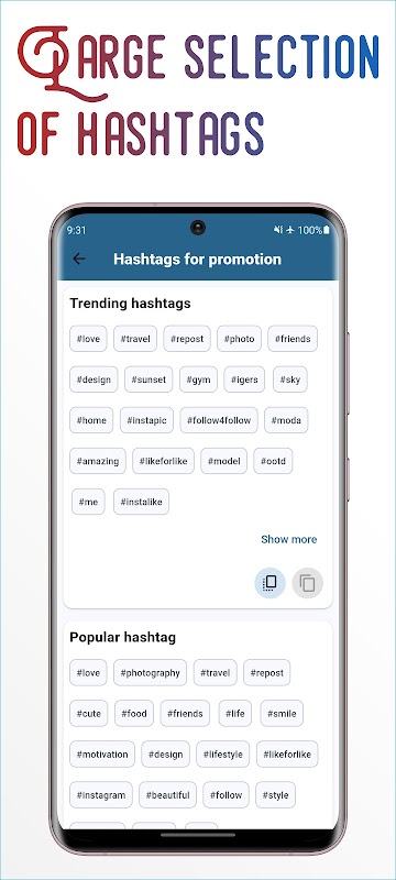 The Hashtags app has a nice and thoughtful design. All hashtags for likes are sorted by categories for easy searching. You can quickly copy the hashtags for likes in social media. Save hashtags for likes in the application so you do not lose them.