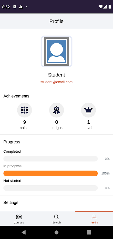• View their progress and gamification points, levels and badges.