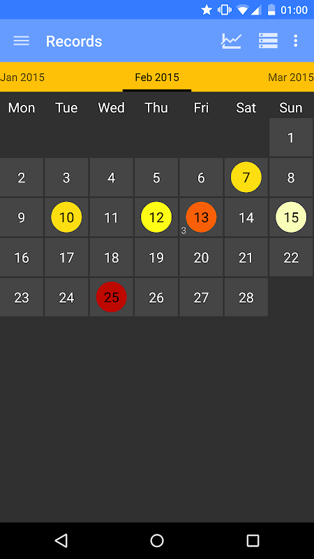 • View your headaches in a calendar view. Quickly and easily update, delete or add new headaches from the calendar view. The calendar view can be useful in finding patterns in headaches