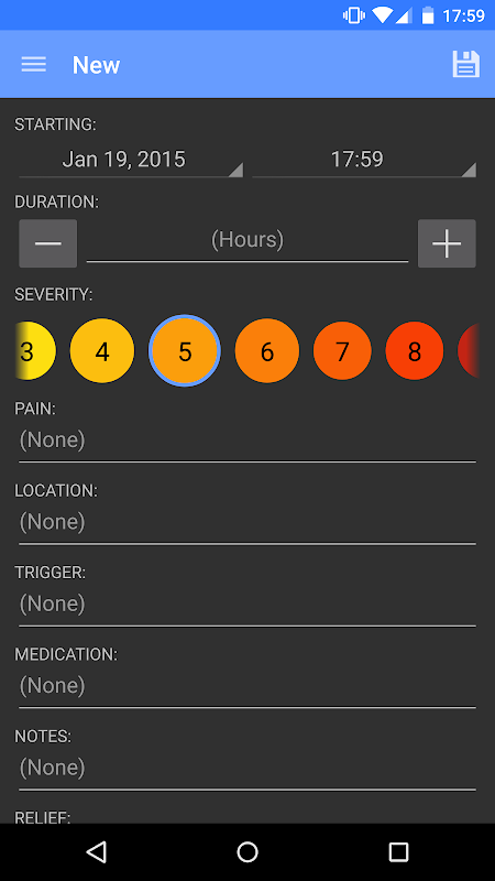 • Track the type of pain associated with a headache such as migraine, throbbing, dull, sharp nausea and many more. Custom pains can be added as well