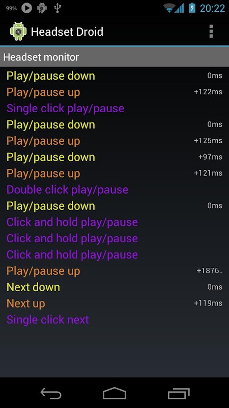 * If no conflicts are found, use the Headset monitor to see how Headset Droid is receiving and handling button interaction.