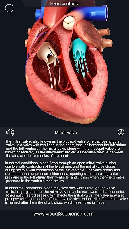 My Heart Anatomy gives users an in depth look at the heart allowing them to select , xray view, hide and show parts of the heart as well as view real time animation, draw or white on screen and share screenshots, Audio pronunciation for all anatomy terms and more.