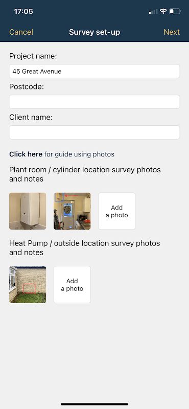 1 - Heat Loss survey, with photos designed to meet BS EN 12831, CIBSE Domestic Heating Design Guide and MCS standards. When the survey is completed you can send it to your account at www.heat-engineer.com