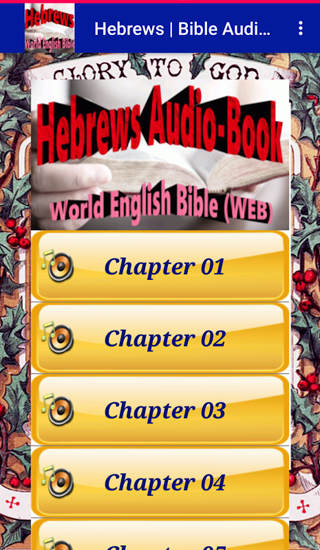 An app for anyone who want to know about Christianity directly from the source (Bible). Enjoy Complete chapter of Hebrews (The Epistle to the Hebrews) in good quality audio with transcript (text). Enjoy the beauty of God's word anytime and everywhere -- even without internet connection (offline) -- via your Android gadget. This app presents you the complete chapter of Hebrews based on World English Bible (WEB). You can enjoy it all in quick, simple, and easy way. A must for devoted Christian soul.
