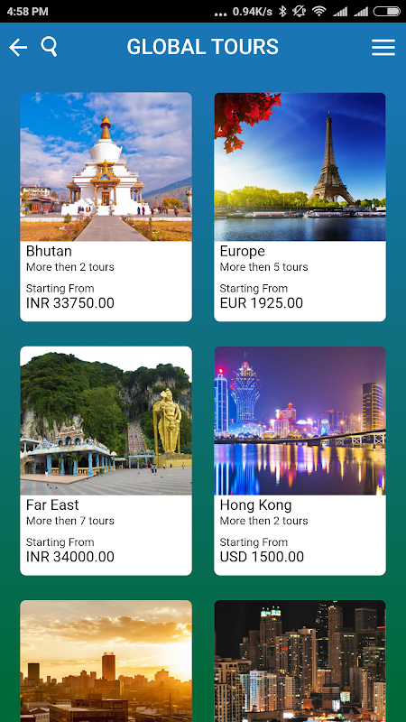 Heena Tours and Travels App allows you to view International Tours as well as Domestic Tours (Indian Tours), and view itineraries, hotel information, and destination information of all the tours offered by Heena Tours and Travels. With Heena, you get Pure Vegetarian Tours, which is our specialty. You can also search for various tours, using the app.