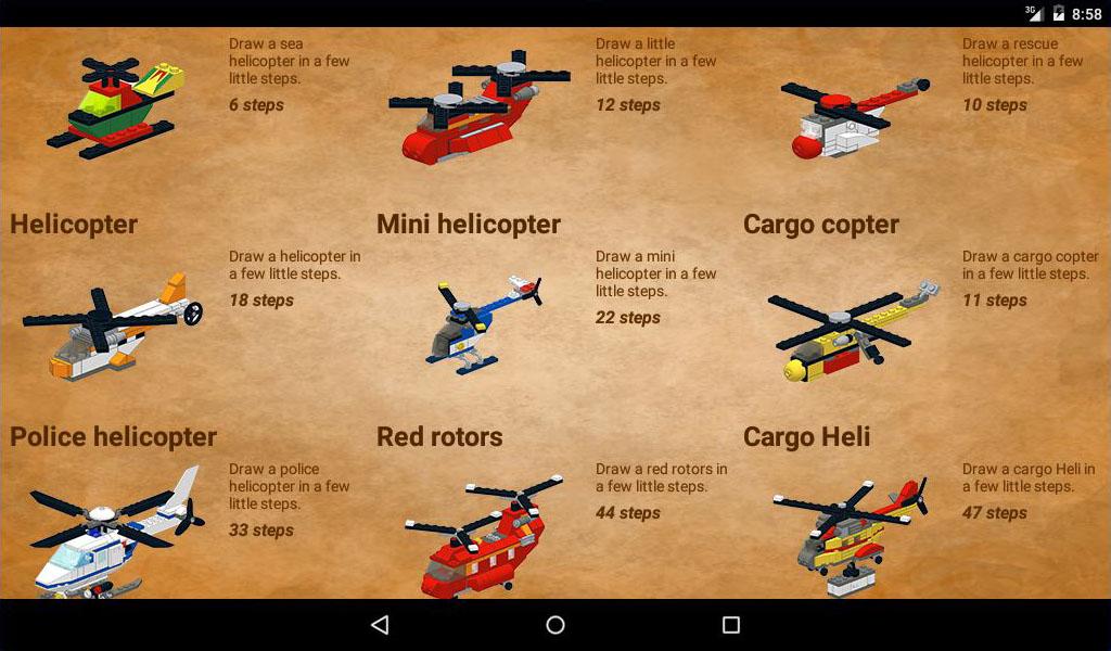 Follow the step-by-step instructions to build helicopter figures. Playing is fun and will add a lot the development of motoric skills. This puzzle game is really for all ages. Bring the bricks together and follow the color pattern.