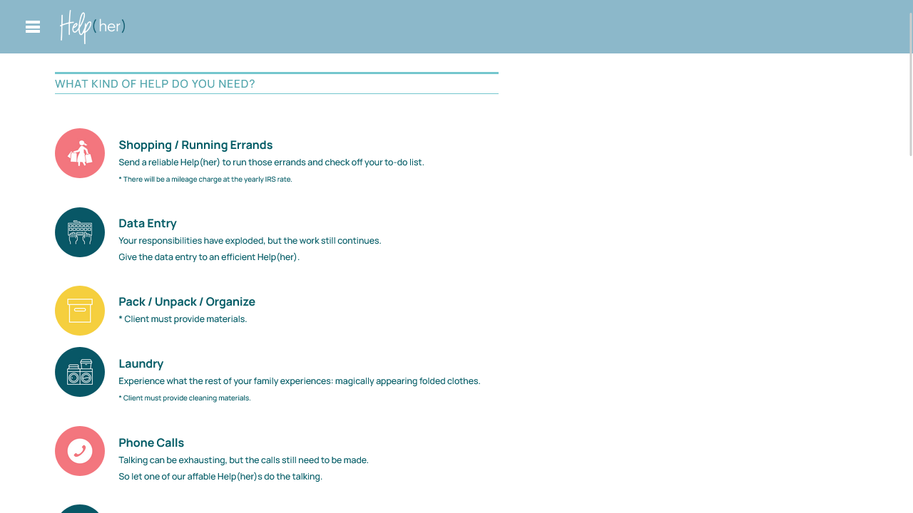 Help(her)s are highly-qualified women that are stay at home mothers, freelancers, or just want to pick up a side hustle in order to complete short term projects and cross off to-do lists.