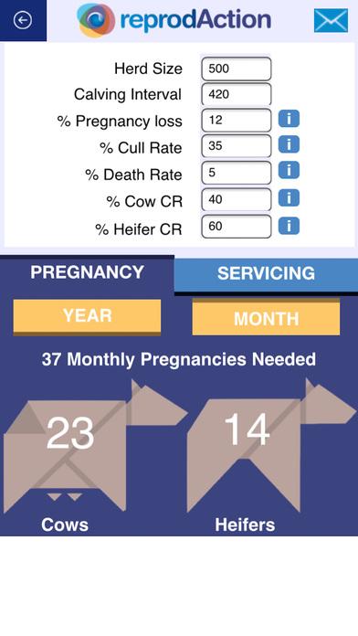 After the parameters have been entered, touch the Pregnancy button (year or month) and values will show the Number of Pregnancies Required by year or month to maintain the herd. The number of pregnancies required will result between lactating cows and virgin heifers. Then, by touching the Servicing button, the app will calculate the Number of Servicing needed by year or month to generate the pregnancies required; the number or servicing will result between lactating cows and virgin heifers and is calculated depending on the average conception rate.