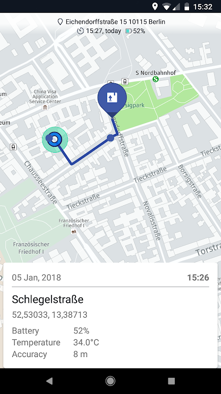 - Live on-map tracking of the tracking device, or of both the current user’s position and the device