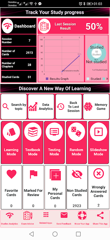 - 5 Study modes (learning mode, Testing mode, handout mode, test mode, slideshow mode & random mode).