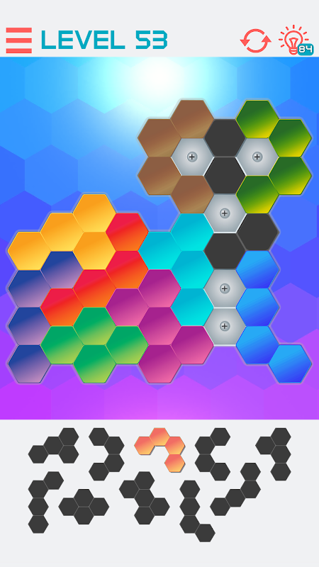 This game is very simple to get started, anyone should be able to start playing immediately. In the middle of the screen, you are presented with a geometric shape consisting of hexagonal grids. On the bottom of the screen are the "jigsaw" pieces. Drag and drop the pieces into the shape to complete the shape. You can drop the pieces onto the board and if they fit, they will snap. You win the game when all the shapes have been placed on the board and the board is completely filled with no overlaps.