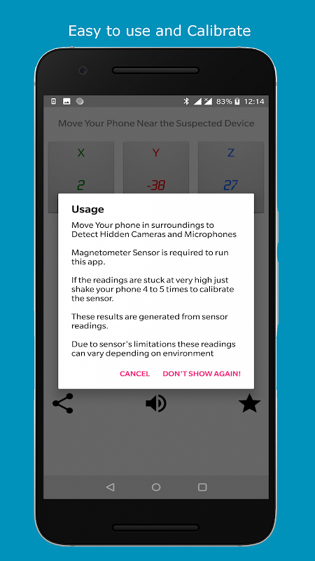 If the reading is stuck at very high then you just have to shake the phone in an 8-figure shape to get it working again. This magnetic field sensor is must to run Hidden Camera Detector. This way anyone with android phone having magnetic field sensor can detect hidden camera and microphone easily. This hidden camera detection featureis also helpful in finding devices that are lost or hidden.
